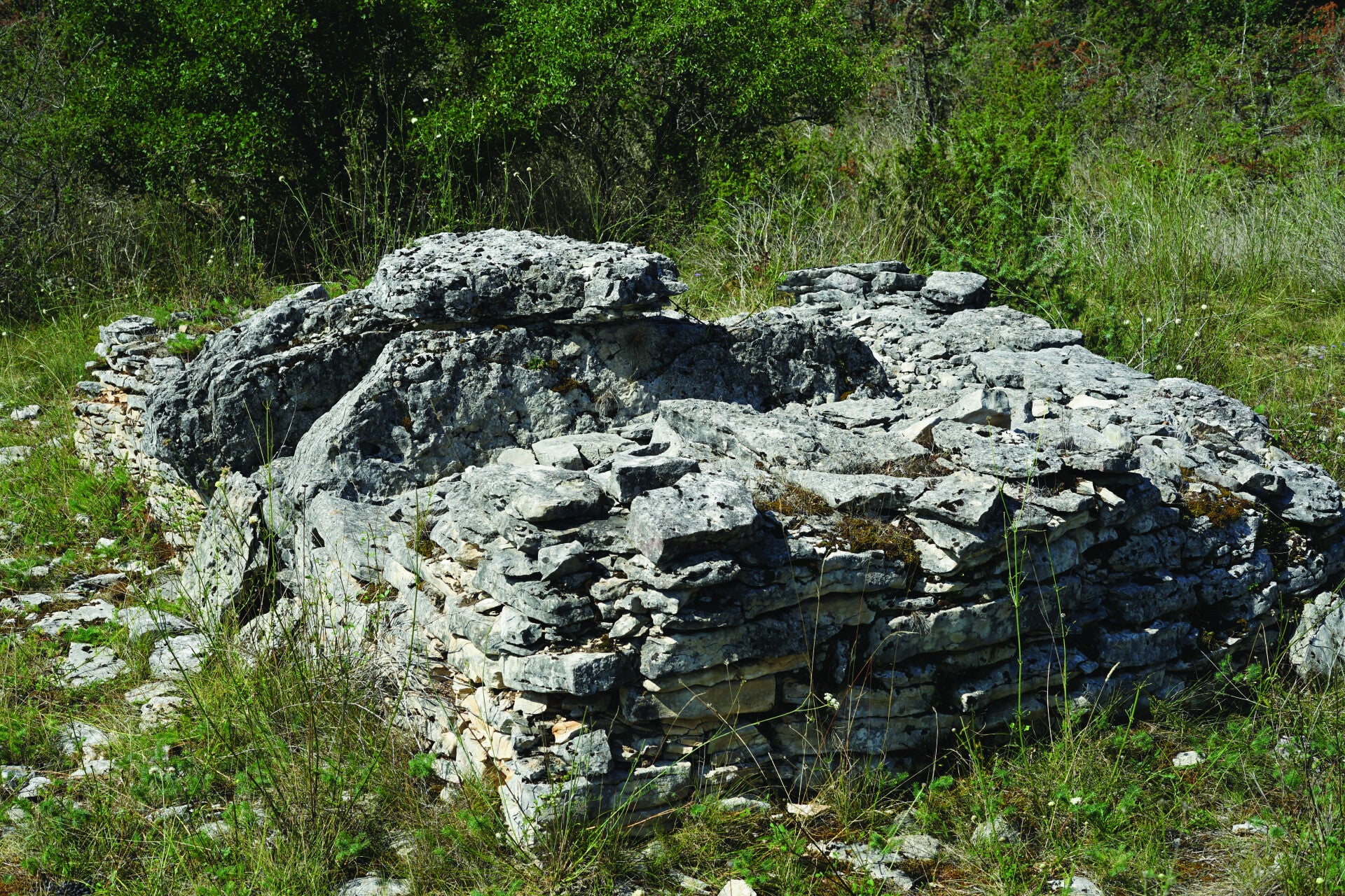 Avant la fouille le tumulus se présentait comme une grosse butte de 29 m de diamètre. Elle contenait un dolmen avec une table de 4,90 m x 2,70 x 0,95 pesant dans les trente tonnes, ce qui en faisait un monument de grande taille du Quercy. Les piliers et la dalle de chevet ont été retaillés. Un percuteur de granit de 5,5 kilogrammes a été trouvé devant l’entrée et deux de ses éclats à la base d’un pilier. Les supports, longs de 1,92 m et de 1,84 m sont implantés dans des rigoles surcreusées dans les lapiaz. Une datation C14 sur un os découvert à la base externe du chevet donne - 3353/- 3033. Le dolmen est entouré d’une plateforme rectangulaire. Conservée sur 1,80 m de hauteur vers l’entrée, elle n’atteint que 30 cm vers le chevet. Sa longueur est repérée sur 18 m. Le dolmen est décentré et situé sur le petit côté le plus haut qui fait office de façade et donne accès directement à la chambre sans couloir.