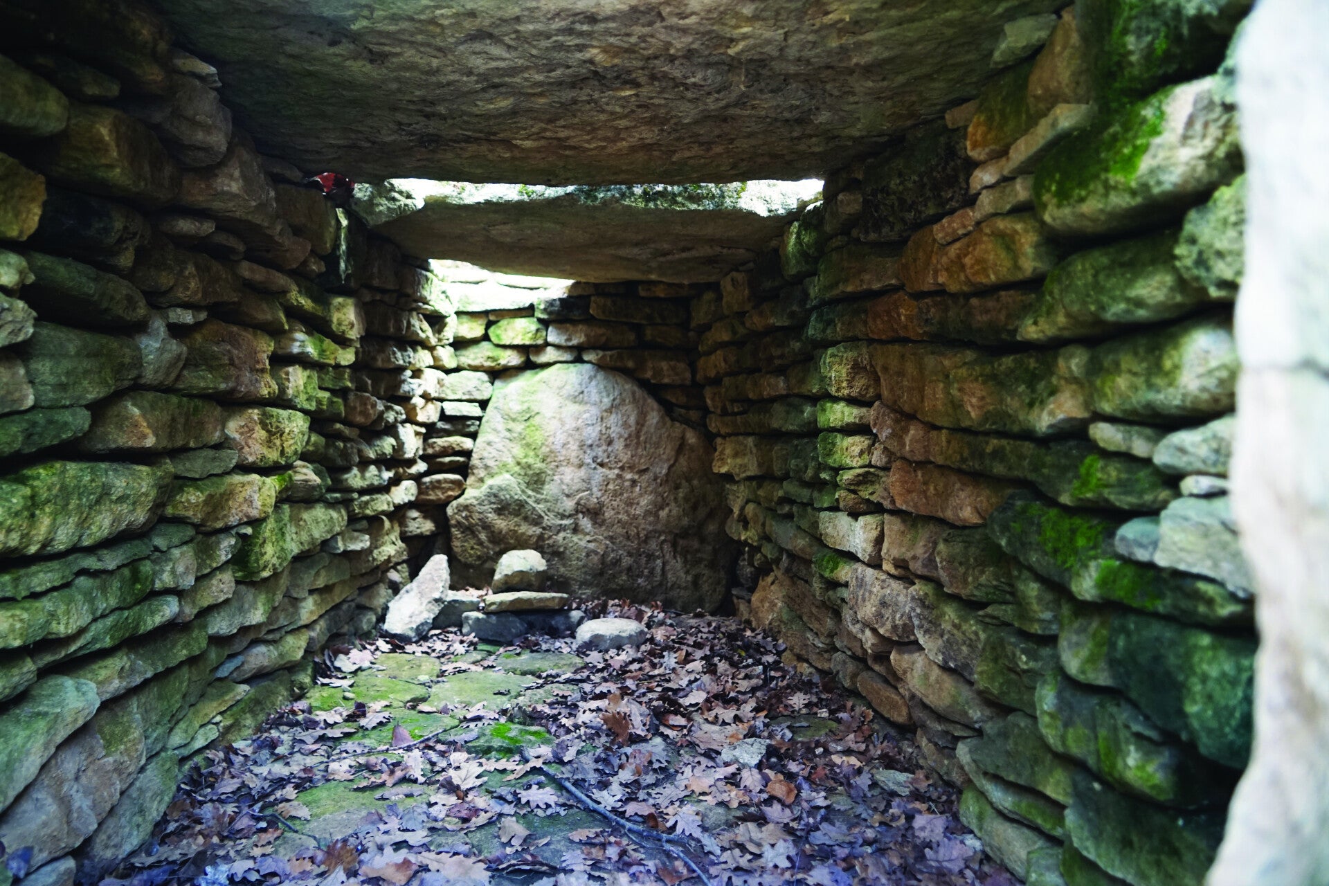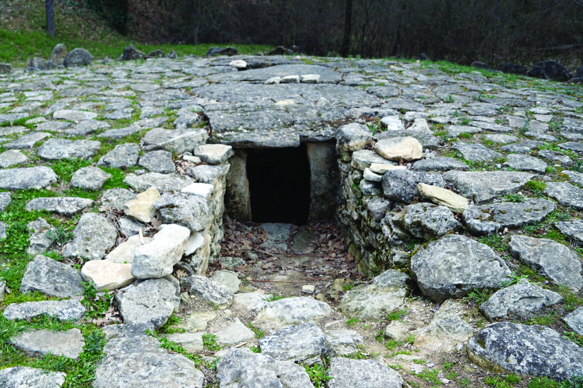 En son centre, une chambre longue de 2,90 m était recouverte de trois dalles. La plus grande mesurait 2 m de long pour une largeur de 1,35 m et une épaisseur de 25 cm. Les parois, en pierre sèche, délimitaient une surface de 3 m2. Le sol était recouvert d’un dallage réalisé avec des pierres de 10 à 40 cm de long. L’accès marqué par une pierre de seuil se faisait par l’embryon d’un couloir long d’un mètre. Il n’atteignait pas l’extérieur du tertre, mais par une sorte de fosse qui était comblée après chaque utilisation.