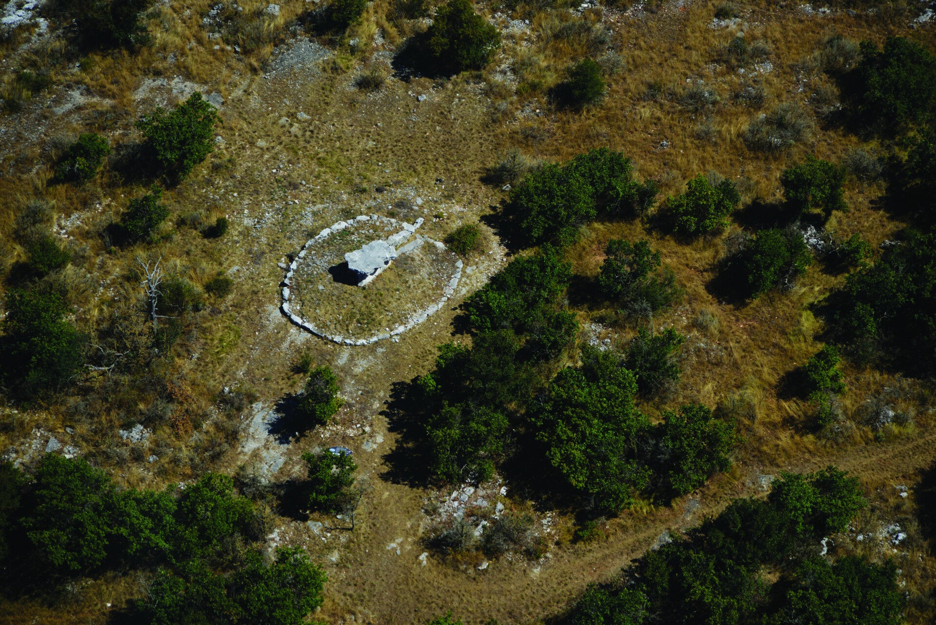 Près de la falaise, face à un immense panorama, le monument avait été élevé sur un monticule naturel. Cela accentuait sa domination sur le paysage. Le dolmen est inclus dans une structure circulaire d’une dizaine de mètres de diamètre bordée de grande pierre. Pour le comblement, quatre faciès de calcaire ont été utilisés. Les trois quarts proviennent de l’emplacement du monument, les autres d’un environ immédiat. Pour les pierres du remplissage, les constructeurs se sont contentés des pierres les plus proches.